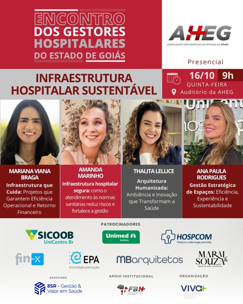 A Associação dos Hospitais do Estado de Goiás (AHEG) promoverá, no dia 16 de outubro, a partir das 9h, o 5º Encontro dos Gestores Hospitalares do Estado de Goiás. O evento será realizado no auditório da associação, na Alameda Botafogo, nº 101, Centro, em Goiânia (GO), com o tema central “Infraestrutura Hospitalar Sustentável: Inovação, Tecnologia e Espaços Inteligentes para a Saúde”.