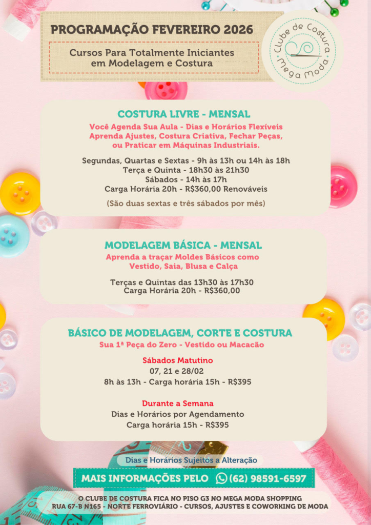 Goiânia, fevereiro de 2026 – A valorização do feito à mão e do saber artesanal, apontada por pesquisas internacionais como uma das principais tendências da moda para 2026, reforça a importância da formação técnica em costura e modelagem. Em Goiânia, o Clube de Costura, projeto institucional do Mega Moda Shopping, inicia fevereiro com uma agenda voltada à aprendizagem prática, oferecendo cursos para quem deseja dar os primeiros passos ou aprofundar conhecimentos na área.
