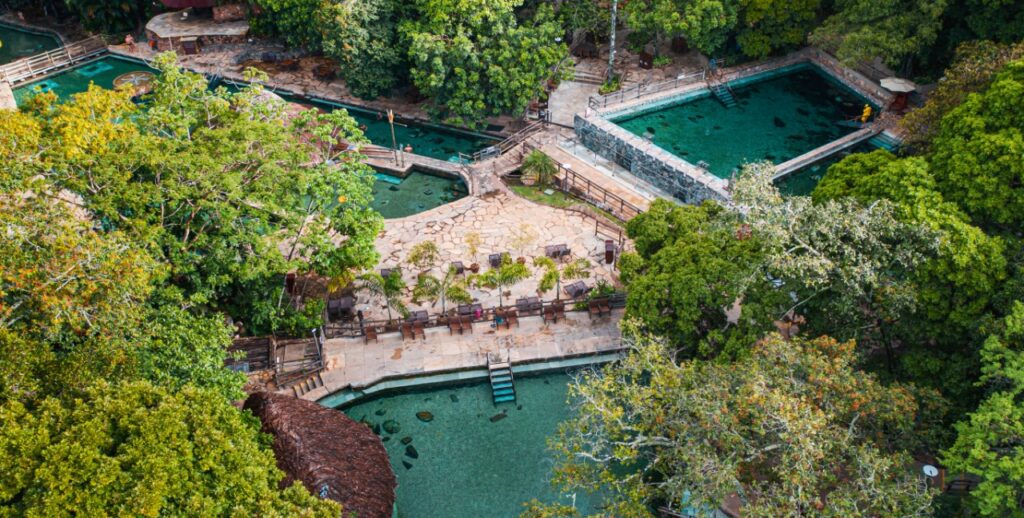 As águas naturalmente quentinhas são resultado de um processo geotérmico milenar que é único no mundo, com destaque internacional. Diferente de outros lugares, onde a origem é vulcânica, em Rio Quente, a água da chuva se infiltra nas rochas da Serra de Caldas Novas, aquecendo-se e unindo-se aos lençóis freáticos que voltam à superfície nas oito piscinas naturais do Parque das Fontes, que fica aberto 24 horas para hóspedes dos seis hotéis do Rio Quente Resorts: Pousada, Turismo e Cristal, que ficam dentro do complexo, e os externos Giardino, Luppi e Eco Chalé.