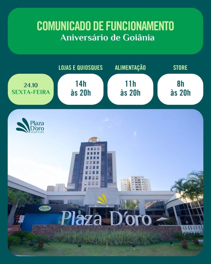 O Plaza D’Oro Shopping divulga o seu horário de funcionamento desta sexta-feira, 24 de outubro, feriado de aniversário de Goiânia: