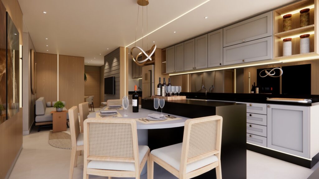 Com a rotina mais dinâmica e agitada, é cada vez mais comum valorizar ainda mais os encontros com amigos e familiares em casa, onde os convivas têm mais conforto e liberdade. Nesta hora, a gastronomia entra em cena e, na hora de preparar os pratos, o anfitrião não quer ficar isolado de seus convidados. Não raro, o evento começa com este próprio preparo, em que todos participam e se divertem. Bem diferente do passado, quando o anfitrião preparava tudo antes do convidado chegar e o encontro resumia na refeição em si. “Vivemos um resgate forte da valorização dessa interação familiar durante o preparo das refeições, transformando a cozinha num ponto de encontro. Hoje, também tem sido muito forte a cultura do ‘cozinhar como experiência’”, afirma a arquiteta Thalita Bessa, que lançou mão dessa integração cozinha/living no apartamento decorado de 122 m², que projetou para o mais recente lançamento da Yutá Incorporadora, o Synergia Bueno, em Goiânia.