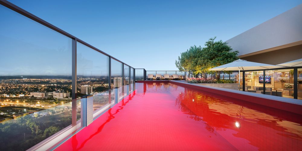 Antes restritas a hotéis de luxo ou casas de celebridades, as piscinas coloridas começaram a ganhar espaço no cenário internacional da arquitetura e, em Goiânia, chegaram pela primeira vez em 2021 com o Emirates Parque Flamboyant. O projeto, assinado pela Sousa Andrade Construtora em parceria com a Terral Incorporadora e a Humanae Incorporadora, apresentou a Red Pool Emirates: uma piscina vermelha com visão panorâmica de 180º no 30º pavimento, a 90 metros de altura.