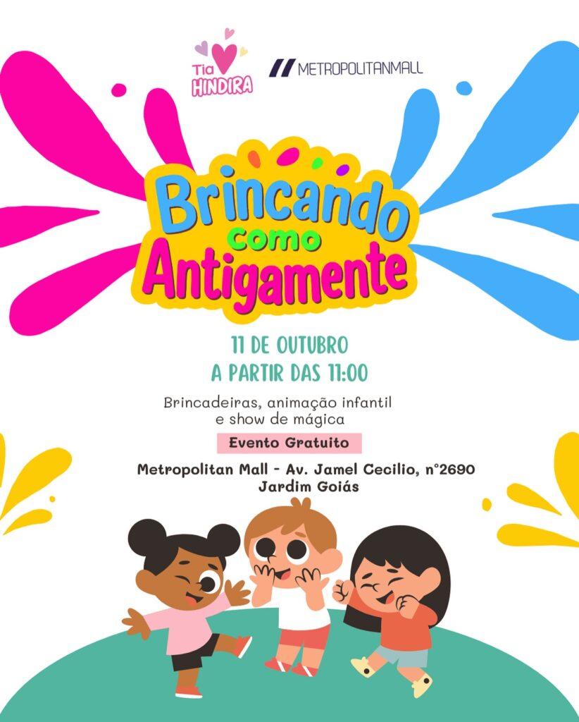 No sábado, 11 de outubro, véspera de Dia das Crianças, o Metropolitan Mall promoverá um evento especial e gratuito para o público infantil e suas famílias. A programação terá início às 11h e contará com animação, oficinas, show de mágica e, principalmente, um incentivo às brincadeiras de antigamente.