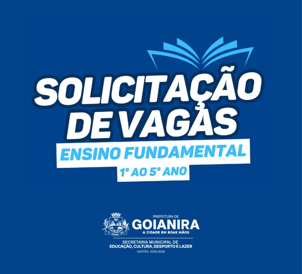 A Prefeitura de Goianira, por meio da Secretaria de Educação, Cultura, Desporto e Lazer, informa que o período de solicitação de vagas para o Ensino Fundamental (1º ao 5º Ano) da Rede Municipal de Ensino será realizado entre os dias 10 de novembro e 1º de dezembro de 2025.
