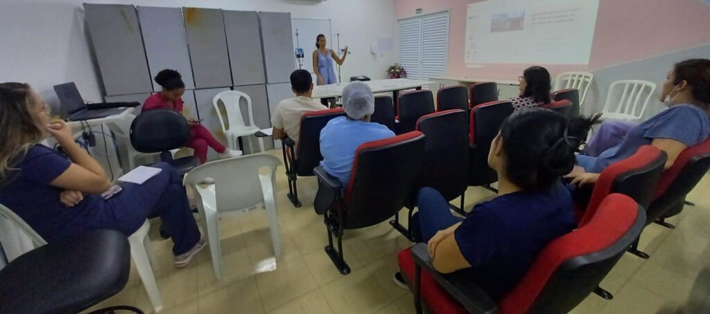 Voltada para equipe de enfermagem da unidade, a capacitação foi elaborada pelas enfermeiras obstetras Alinne Almeida e Samira Hanum e conduzida por Alinne que também é preceptora do programa de Residência em Enfermagem Obstétrica.