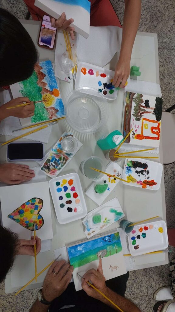 Durante as tardes de atividades, pacientes e acompanhantes participaram de oficinas de modelagem em argila, conduzida pela escritora e artista visual Rosy Cardoso; e pintura em tela, ministrada pela artista naïf Helena Vasconcelos.