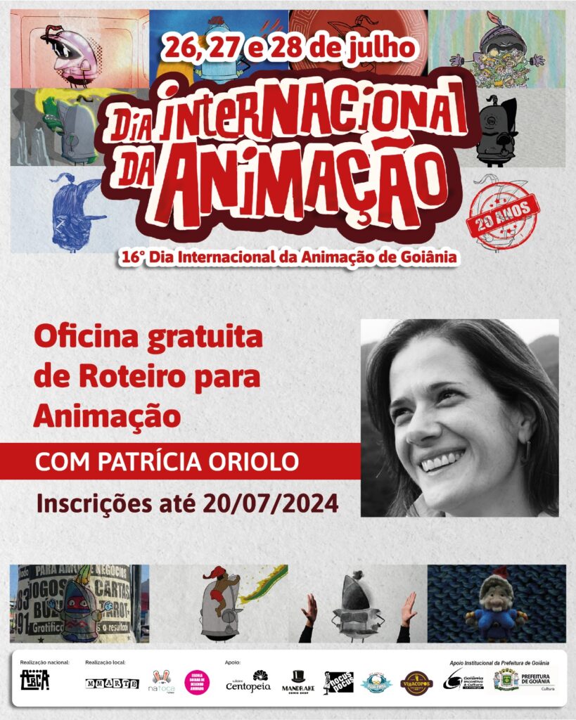 Estão abertas as inscrições para a oficina gratuita de Roteiro para Animação com a roteirista Patrícia Oriolo, de São Paulo. A atividade, que faz parte da programação da 16ª edição do Dia Internacional da Animação de Goiânia, acontecerá nos dias 26 e 27 de julho, das 14h às 18h, e no dia 28 de julho, das 9h às 12h, no Coletivo Centopeia, em Goiânia.