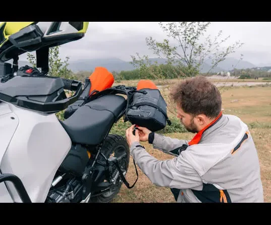 - Coloque os itens mais pesados (ferramentas, líquidos) nas partes mais baixas das malas laterais ou dos alforjes;