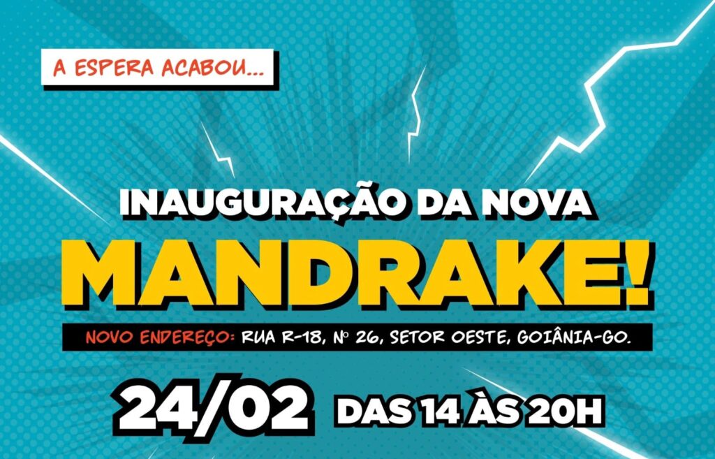 No dia 24 de fevereiro, sábado, das 14h às 20h, a Mandrake Comic Shop oferecerá 30% de desconto nos livros e HQs. A promoção comemora a inauguração da nova loja, localizada na Rua R-18, nº 26, no Setor Oeste, em Goiânia, com destaque para o grafite da fachada assinado pelo artista Fernando 2F.