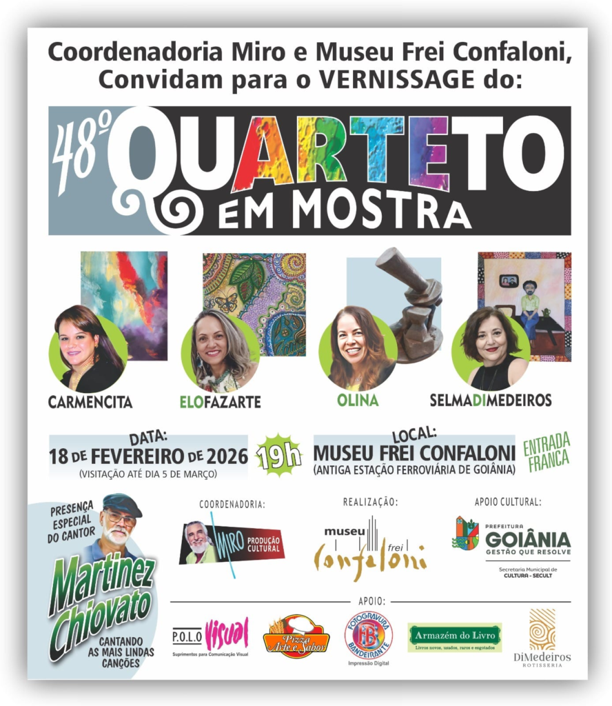 O Museu Frei Confaloni, localizado na Antiga Estação Ferroviária, abre nesta quarta-feira (18/2), às 19h, a vernissage da 48ª edição do Quarteto em Mostra. A exposição reúne os trabalhos das artistas Carmencita, Elofazarte, Olina e Selma Di Medeiros, apresentando ao público diferentes linguagens, estilos e expressões da arte contemporânea.