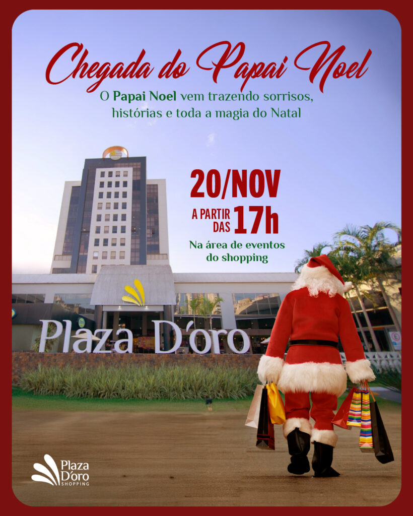 O clima natalino já começa a tomar conta do Plaza D’Oro Shopping, que recebe o Papai Noel no próximo dia 20 de novembro, feriado da Consciência Negra, a partir das 17h. A chegada do bom velhinho será marcada por um momento especial, com atividades lúdicas e ambientação temática que prometem encantar crianças e adultos.