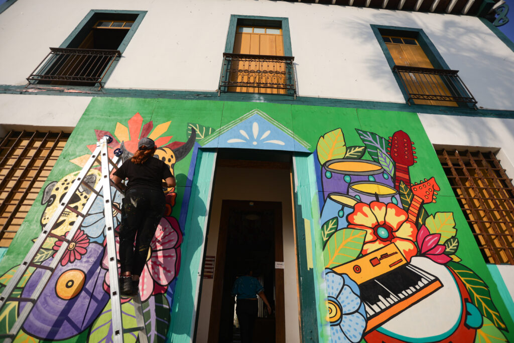 A histórica Pirenópolis recebeu, durante a programação do Canto da Primavera 2024, uma intervenção artística urbana no centro histórico do município. A obra de arte de 15m², localizada temporariamente no Museu do Divino, chama a atenção pelas cores e pela representação de elementos bastante característicos da cidade. Feito com técnicas de spray e acrílico, o painel grafitado é de autoria da artista goiana Thainá Junger e é um presente da 23º edição do festival para o município.