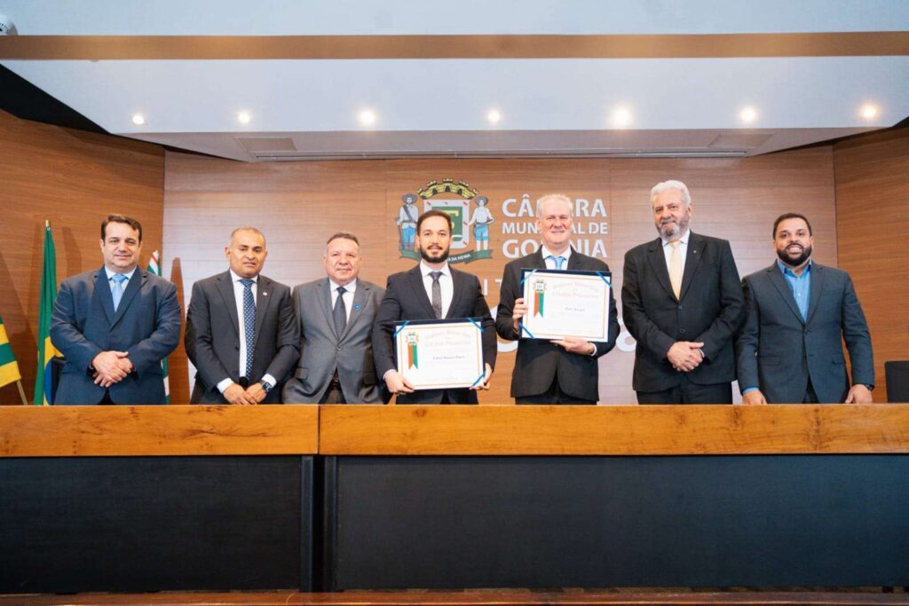 Em seu discurso, lembrou sua origem no Paraná e mudança ao Mato Grosso, enaltecendo o papel da família no sucesso de sua trajetória. Na sessão, o Legislativo também agraciou título ao Gerente Regional da Sicredi Cerrado GO, Fábio Pires. As proposições, aprovadas em unanimidade, partiram dos vereadores Geverson Abel e Ronilson Reis. Na foto, os homenageados e os vereadores, e os presidentes da OCB Goiás, Luís Alberto Pereira e Central Sicredi Brasil Central (BRC), Celso Figueira.