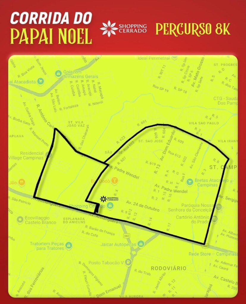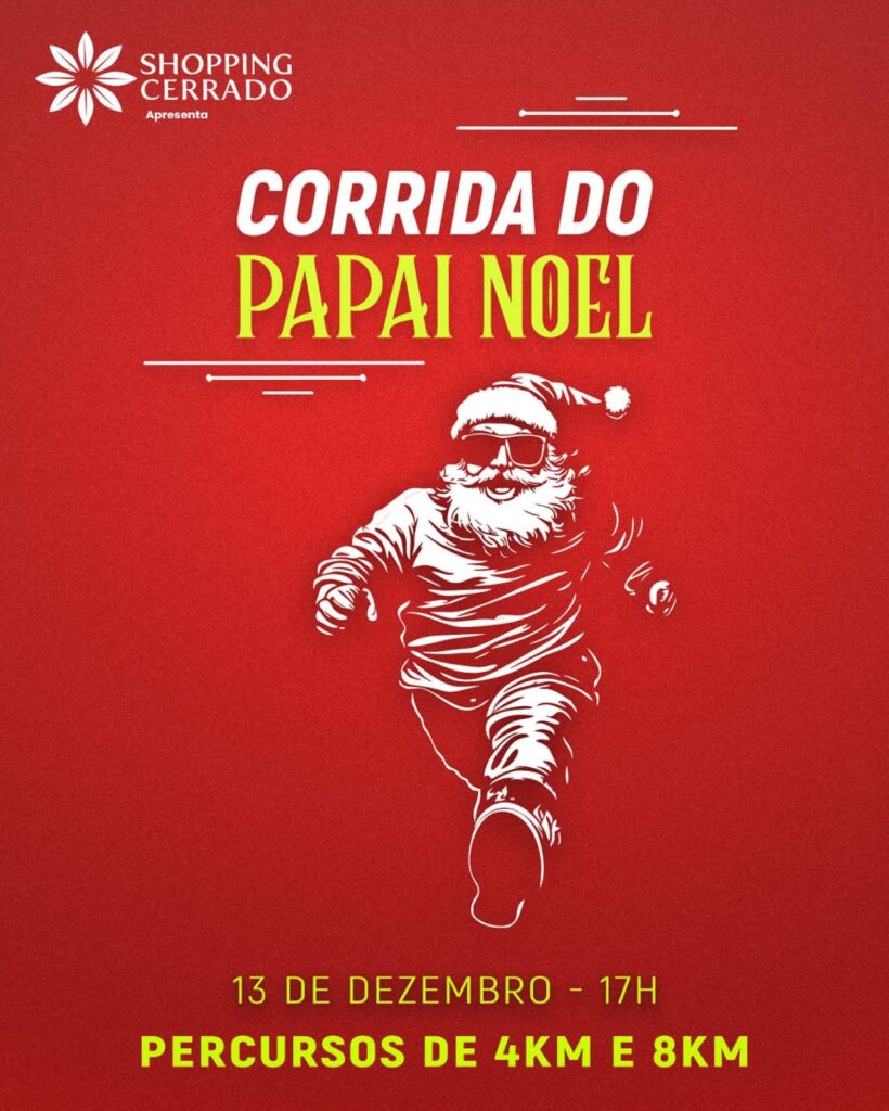 Neste sábado (13), o Shopping Cerrado será, mais uma vez, palco para a Corrida do Papai Noel. O evento esportivo tem largada marcada para às 17h, com opções de percurso de quatro e oito quilômetros. A participação é restrita a praticantes de corrida de rua, de ambos os sexos, que estejam devidamente inscritos e em boas condições de saúde.