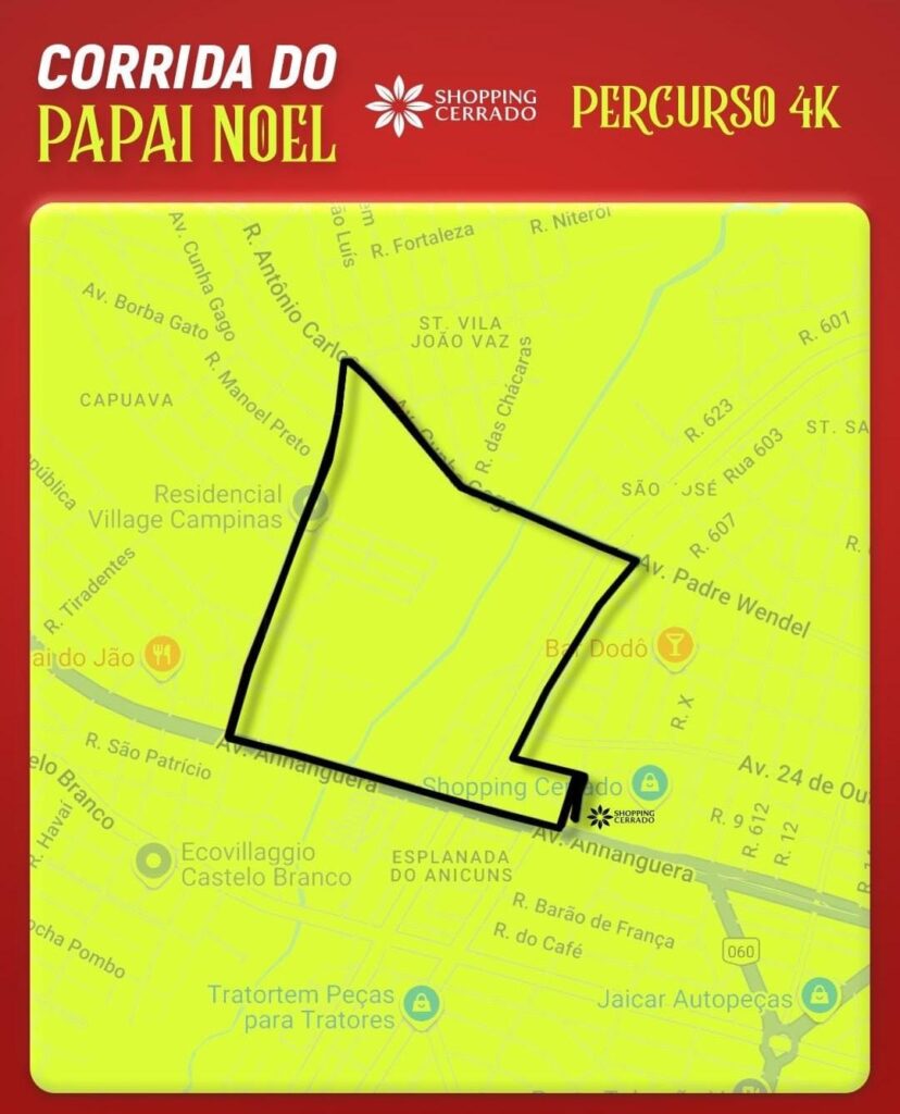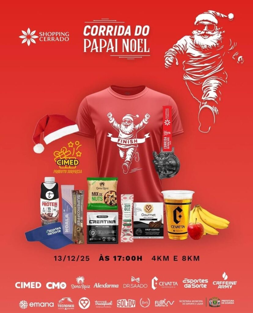 Além disso, haverá pós-prova especial com chopp e ilhas especiais para repor a energia. Mais informações podem ser obtidas no instagram @corridapapainoel. O Shopping Cerrado fica na Avenida Anhanguera nº 10.790, no Setor Aeroviário, em Goiânia (GO).