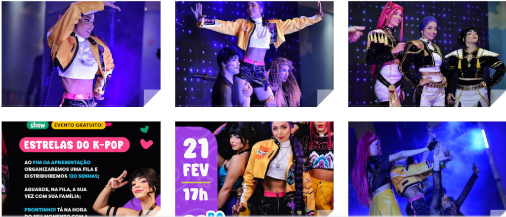 Apresentado pelo grupo Ilumini Personagens Vivos, o show, que acontece na praça de alimentação, convida o público a mergulhar no universo do K-Pop por meio de coreografias vibrantes, performances cativantes e um toque de magia, celebrando a trajetória de três estrelas que conquistaram o mundo com talento, energia e muita música.