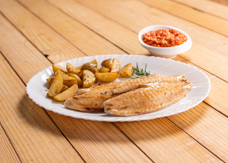 Por fim, sirva os filés acompanhados do molho romesco e batatas.