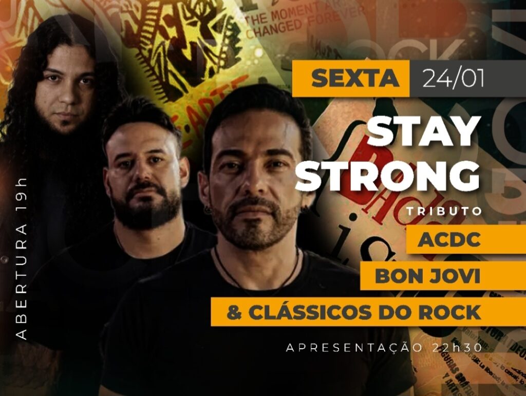 O Lowbrow Lab Arte & Boteco recebe, na sexta-feira (24), a banda Stay Strong. A partir das 22h30, Thiago Resende (vocal), Erick Mamede (bateria) e Raphael Gomes (violão) interpretam clássicos do rock em um tributo às bandas AC/DC e Bon Jovi, em uma performance acústica.