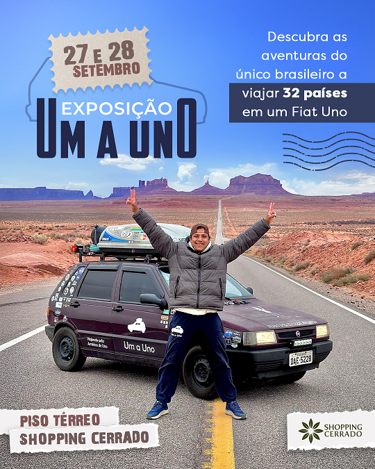 Neste sábado e domingo, 27 e 28 de setembro, o Shopping Cerrado recebe a exposição “Um a Uno”. A mostra, que já passou por diversas capitais brasileiras, aborda a história de Luiz Torelli, o primeiro brasileiro a viajar por 32 países em um Fiat Uno, ano 2002. O veículo, batizado de Sandro, estará exposto das 10h às 22h no piso térreo, em frente à loja Rihappy. O público ainda poderá ver fotos da jornada de mais de 100 mil km e adquirir itens da loja oficial do “Um a Uno”, que tem mais de 700 mil seguidores nas redes sociais.