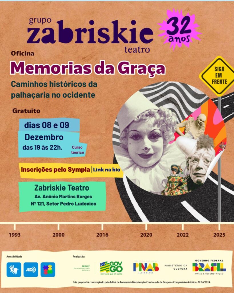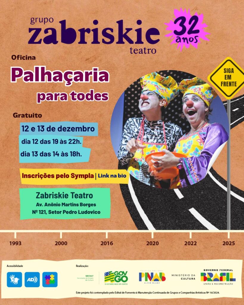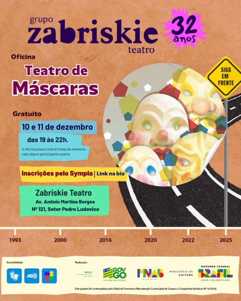 A atividade integra o projeto aprovado no Edital de Chamamento Público nº 16/2024, da Política Nacional Aldir Blanc de Fomento à Manutenção Continuada de Grupos e Companhias Artísticas – PNAB (Lei nº 14.399/2022), cujos recursos são operacionalizados pela Secult Goiás. Mais informações podem ser obtidas no instagram @grupozabriskieteatro ou pelo e-mail zteatro@gmail.com.